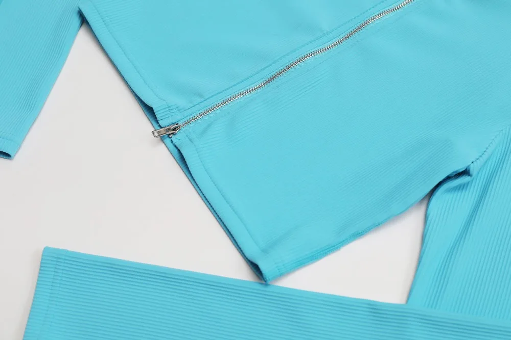 Ribbed Women Sportwear 3 Piece Set Yoga Top Jacket Pants Scrunch Leggings Sports Bra Gym Workout Clothes Fitness Suits