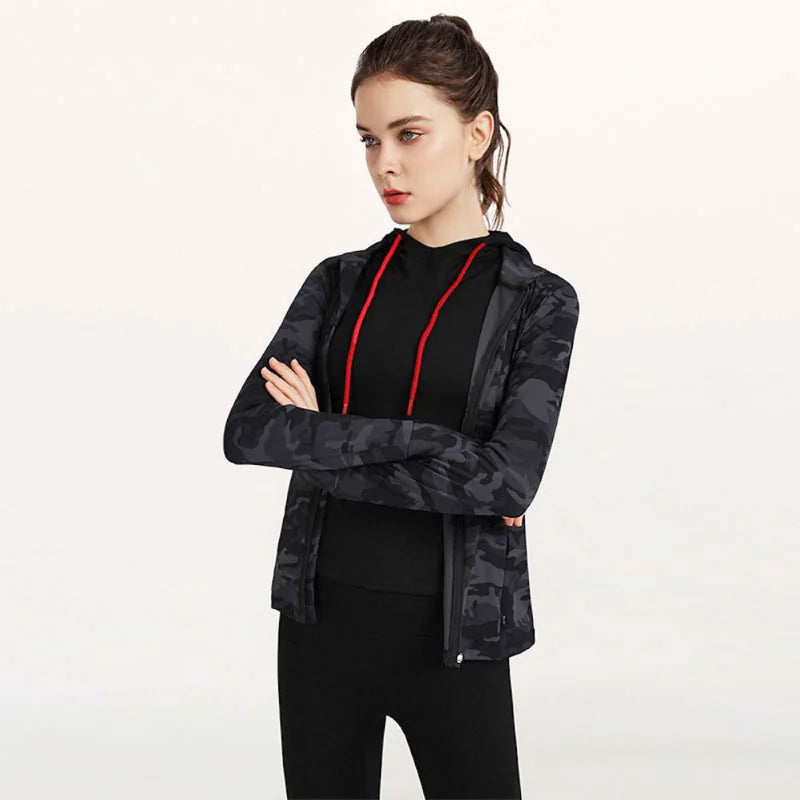Camo Sports Jacket with Thumb Hole Gym Fitness Sportswear Running Top Long Sleeved Outerwear Yoga Camouflage Bomber Jacket Women